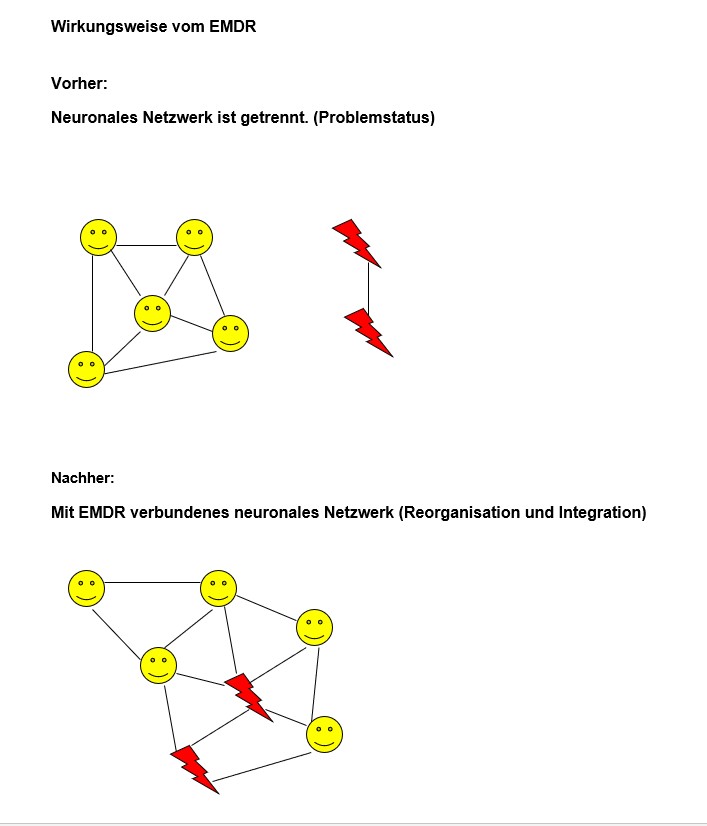 Über die Recht-Links-Stimulation der Augen im Wachzustand des Patienten werden alte, im Erinnerungs-Netzwerk des Gehirns abgespeicherte und belastende Informationen aufgearbeitet.